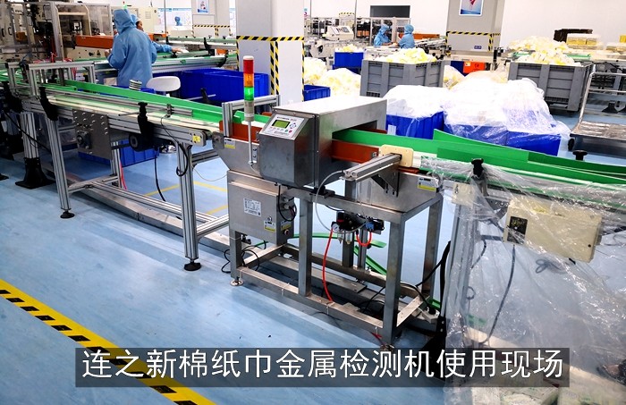 湖北天门某医疗用品集团棉质纸巾生产线采用连之新推杆式金检机使用现场