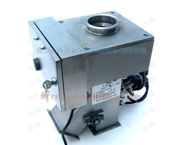 原料从料斗或送料器自由下落进入金属分离器,如果没有金属杂质,原料会直接通过金属分离器流向下端的出料口。如果检测器检测到原料中含有金属,那么控制器立刻启动分离板将金属物和部分原料一起导向侧面的排料口,然后分流板迅速恢复至正常的位置,分流板速度可调,金属分离器的检测精度也可根据生产需要调节,最小可检测并分离出Φ 0.2mm的金属颗粒。